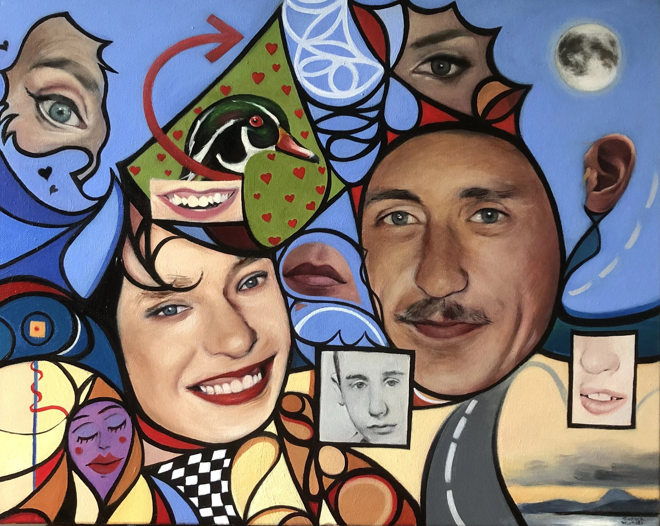 This painting is a portrait of memory, grief, and healing. The central figures are my parents, both of whom passed when I was young. Around them are fragments…faces, features, and symbols representing people and places that shaped me: moments of love, loss, betrayal, and longing.