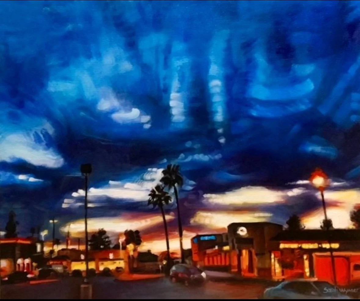 This painting was inspired by one of those evenings. I wasn’t anywhere special, just a local parking lot, but the sky was unforgettable. I wanted to capture that moment, with palm trees silhouetted against the fiery horizon and the glow of shop lights flickering on as day faded into night.